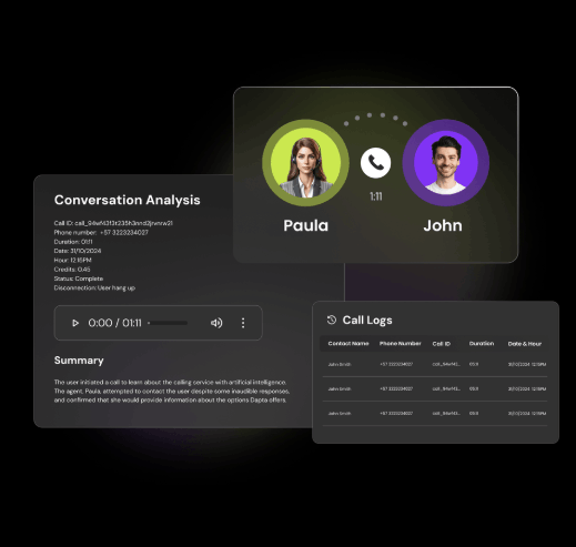 Califica prospectos, agenda citas y personaliza conversaciones fácilmente con agentes de llamadas IA disponibles 24/7. Llamadas automáticas adaptadas a tus necesidades