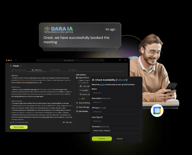 Nuestros agentes de IA llaman, envían mensajes y hacen seguimiento para agendar reuniones y cerrar ventas en piloto automático.